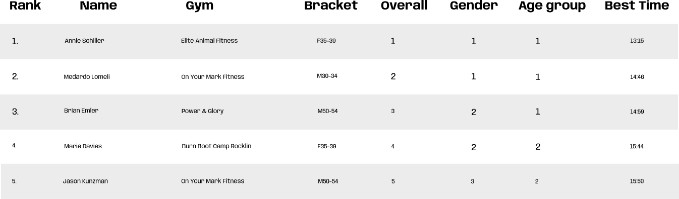 DEKA gamification occurs with DEKA Marks (scores) populating the DEKA global leaderboards and t-shirts and medals are provided to competitors. With consistent DEKA training and periodic re-testing, DEKA Marks (scores) improve.